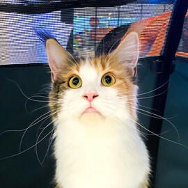Naomi is our first female with the Grand Champion title in the house. The combination of brown patch tabby and white makes her look more majestic in the daytime.